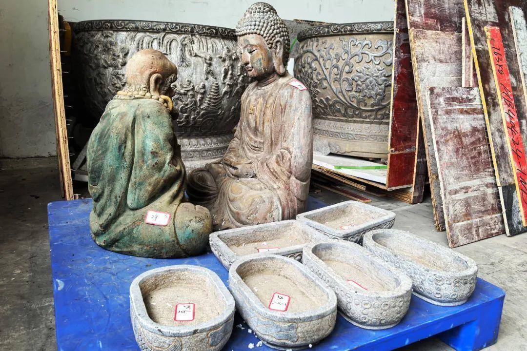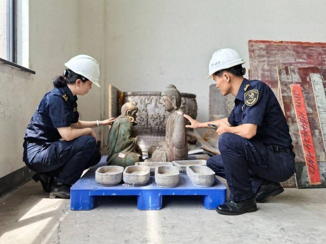 当日,东兴海关对申报为“瓷制摆件”的出口货物进行查验时,发现实际物品为2个分别雕有花卉纹和人物故事浮雕的大石缸,石缸内存在大量未申报的瓷瓶、摆件、字画、雕像和手串挂件类工艺品,疑似文物。
