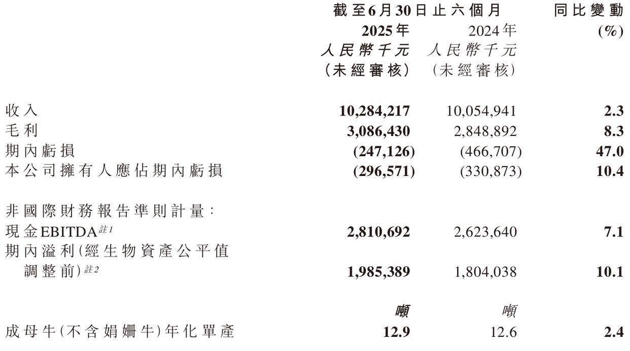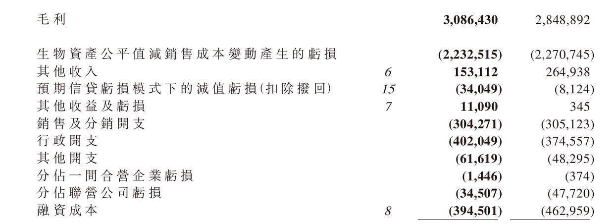 2025年上半年,公司毛利为30.86亿元,同比增长8.3%。记者注意到,其生物资产公平值减销售成本变动产生的亏损依然居高不下,由去年同期的22.71亿元微减至22.33亿元。